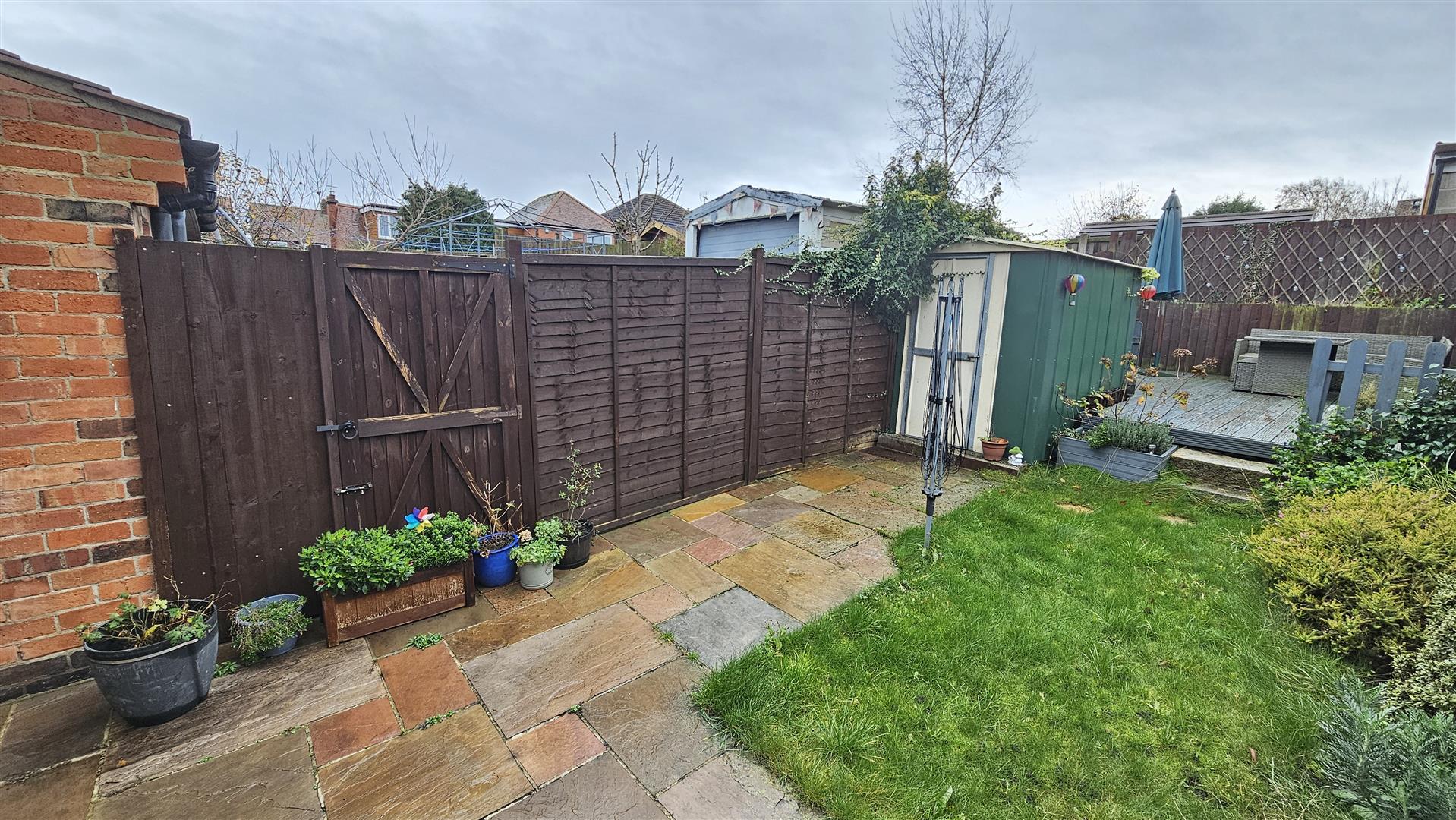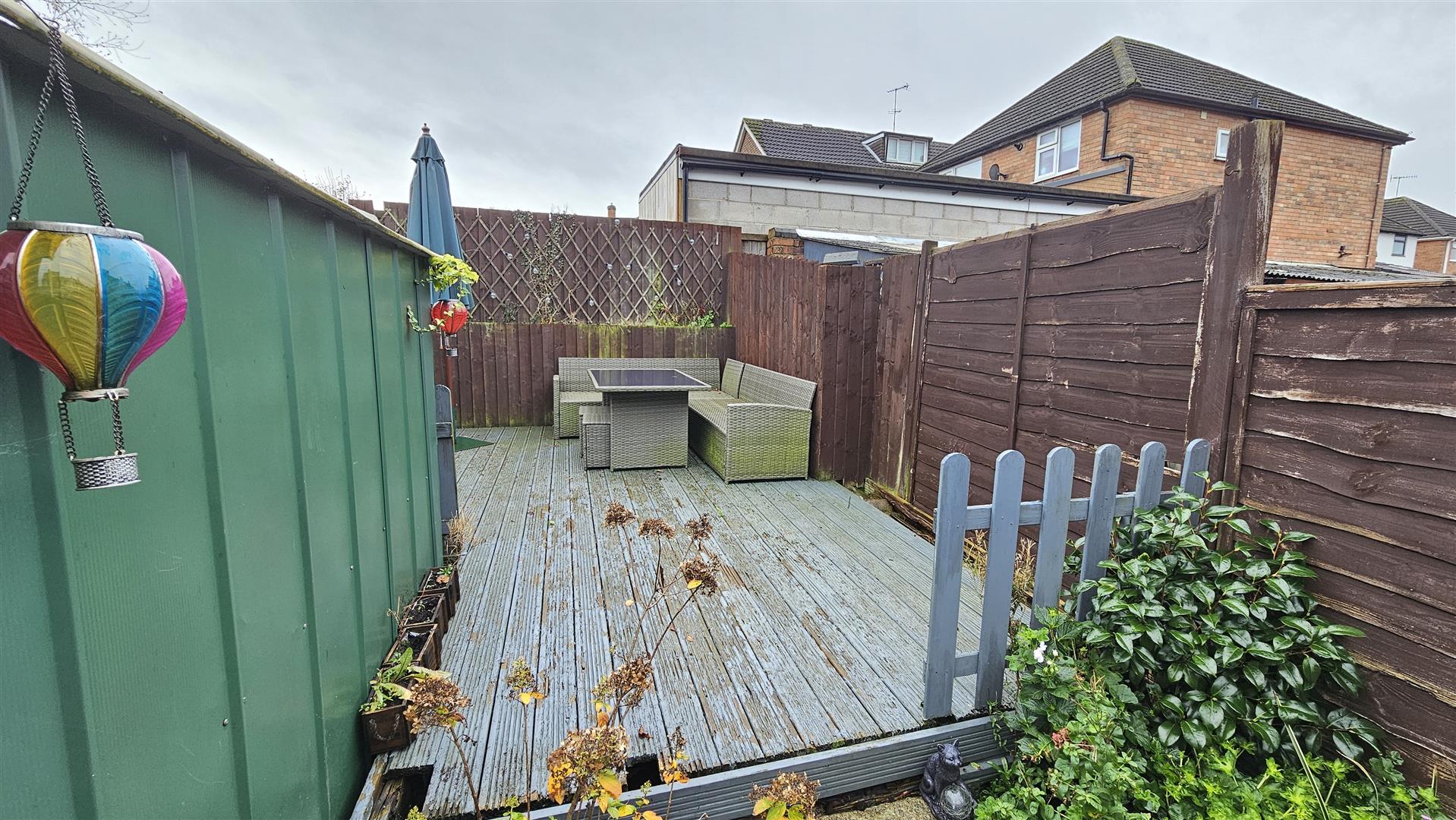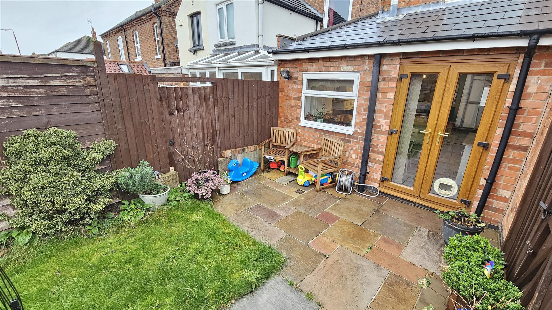 To the rear is a sensibly landscaped and fully enclosed garden that is laid to lawn, with an extended area of patio for al fresco dining and entertaining with both a decking and fenced boundaries to enable secure play for little ones.